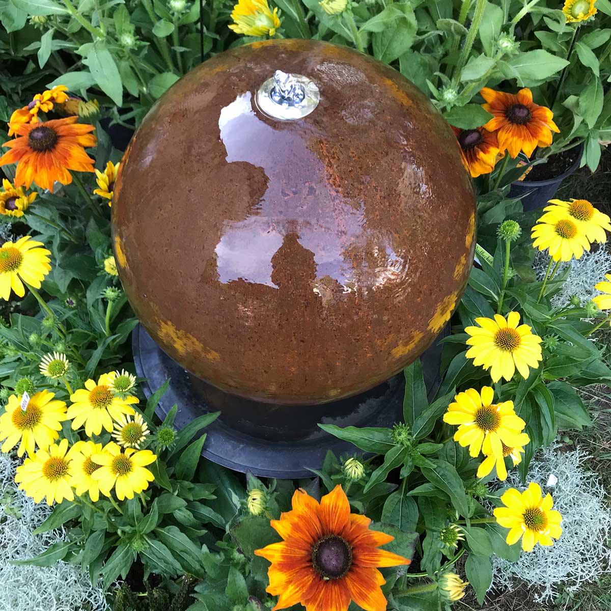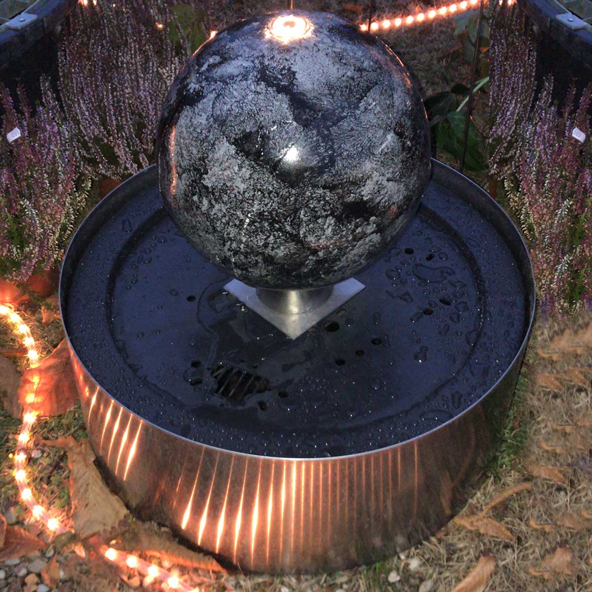40cm / Edelstahl und Cortenstahl / Kugel D ca. 40cm / Säule H ca. 5cm,D ca. 5cm / Becken H ca. 25cm, D ca. 53cm, mit GFK Deckel / Pumpe ca. 450L – 5 Watt / mit 4er oder 6er LED
